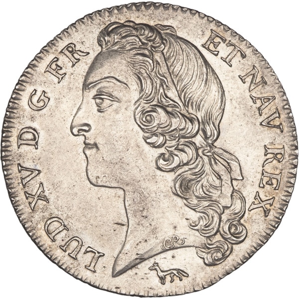 Av. LUD. XV. D. G. FR. ET NAV. REX. Tête à gauche du Roi, ceinte d’un bandeau, signature JCR en monogramme sur le cou ; au-dessous (différent).