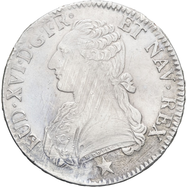 Av. LUD. XVI. D. G. FR. ET NAV. REX. Buste du Roi à gauche, portant une veste brodée, avec l’ordre du Saint-Esprit, les cheveux noués sur la nuque par un ruban. Signature B. DUVIV. F. sur la tranche du buste ; au-dessous (différent).