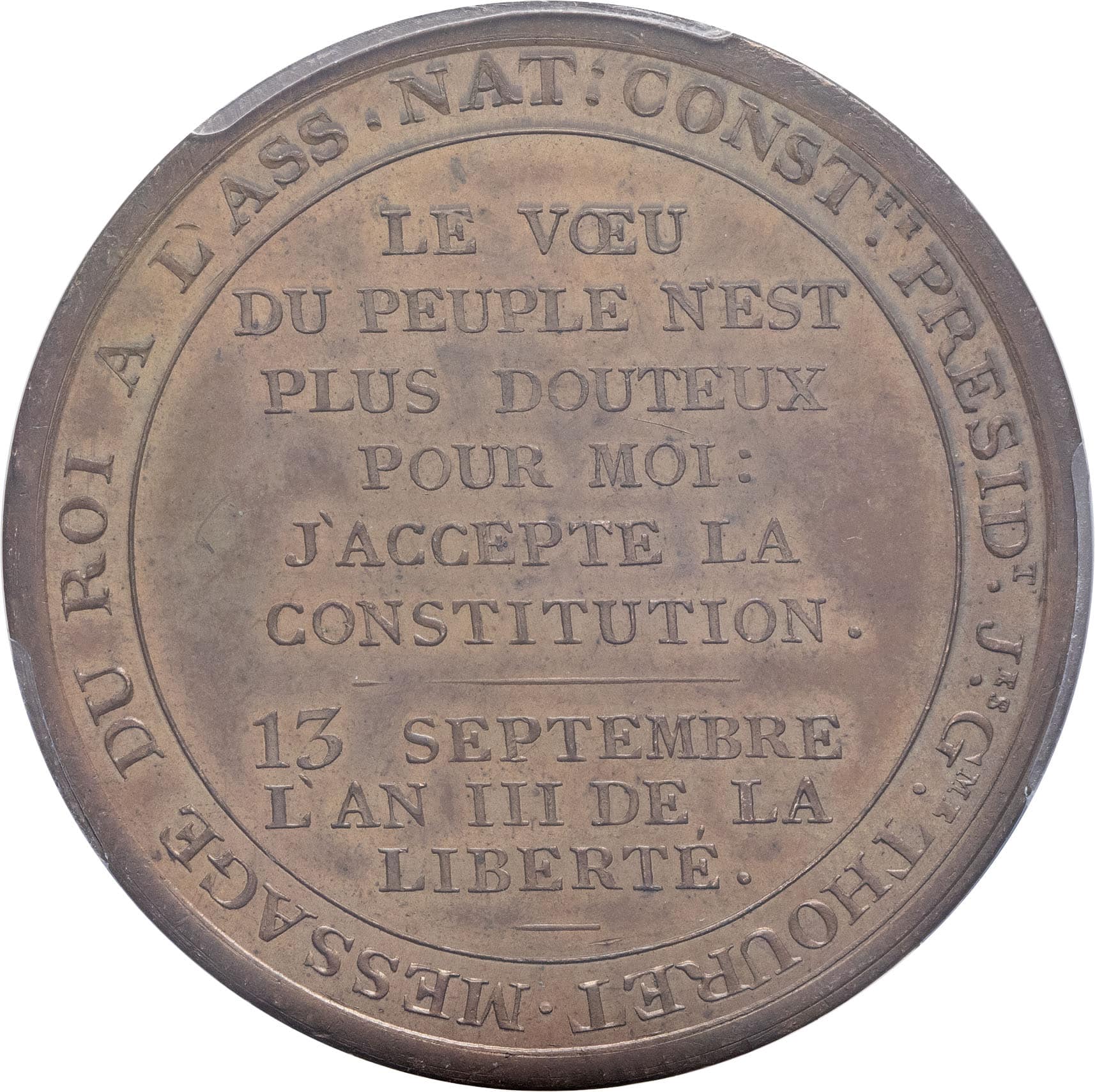 Constitution (1791-1792). Médaille acceptation de la Constitution par Louis XVI par Dupré 1791.
