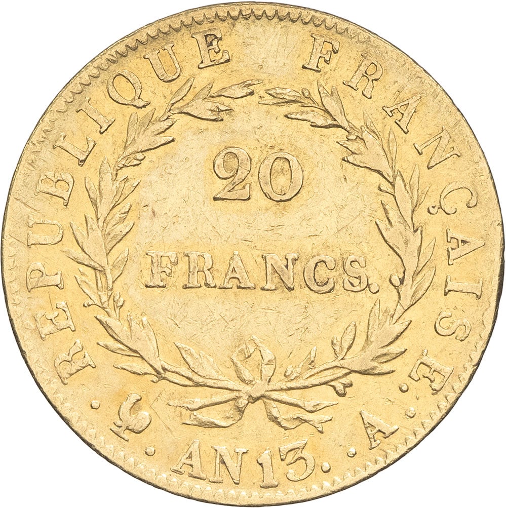 - Premier Empire / Napoléon Ier (1804-1814). 20 francs tête nue, calendrier révolutionnaire An 13 (1805), A, Paris.