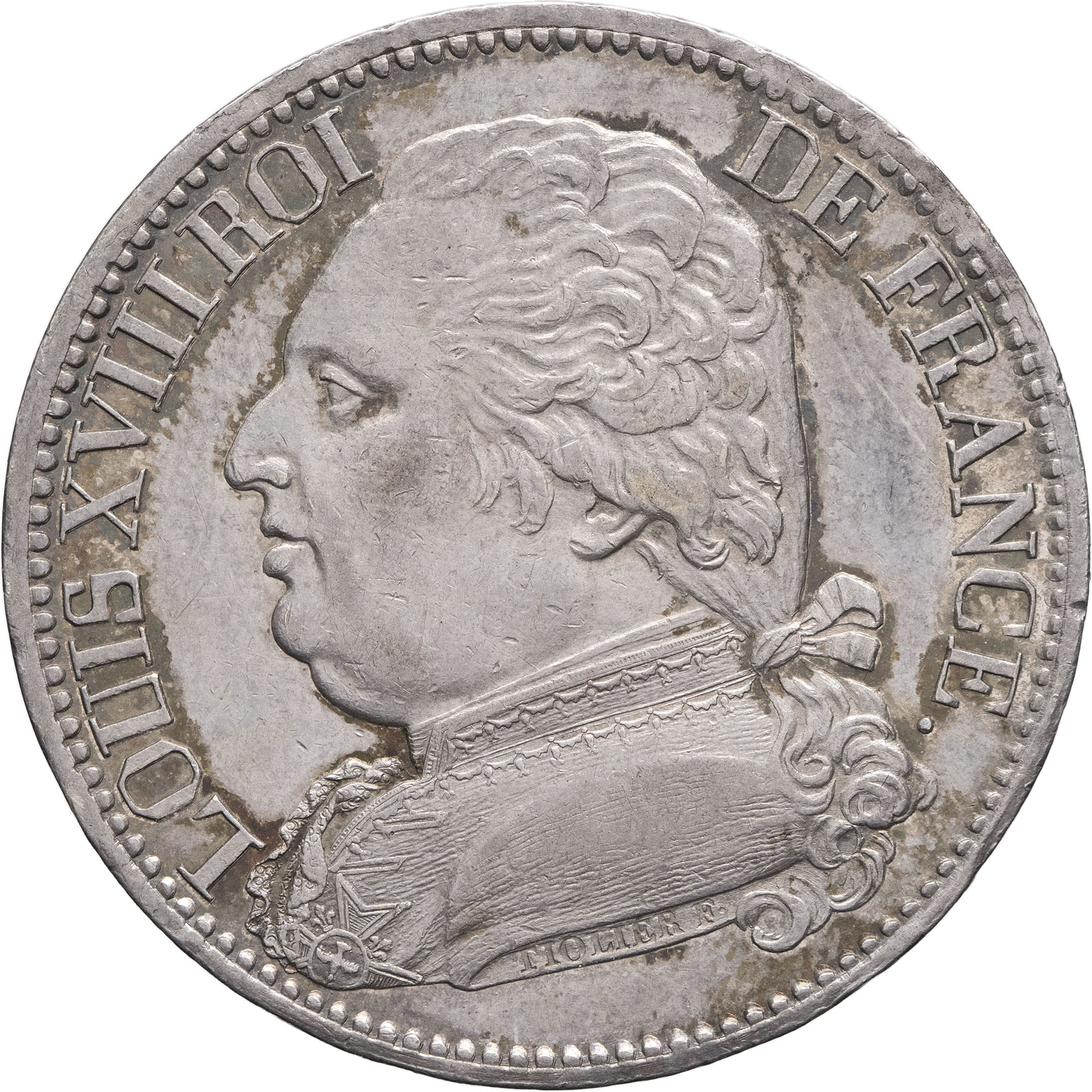 Av. LOUIS XVIII ROI DE FRANCE. Buste habillé de Louis XVIII à gauche, au-dessous signature TIOLIER F.