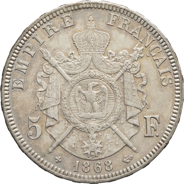 - Second Empire / Napoléon III (1852-1870). 5 francs tête laurée 1868, BB, Strasbourg.