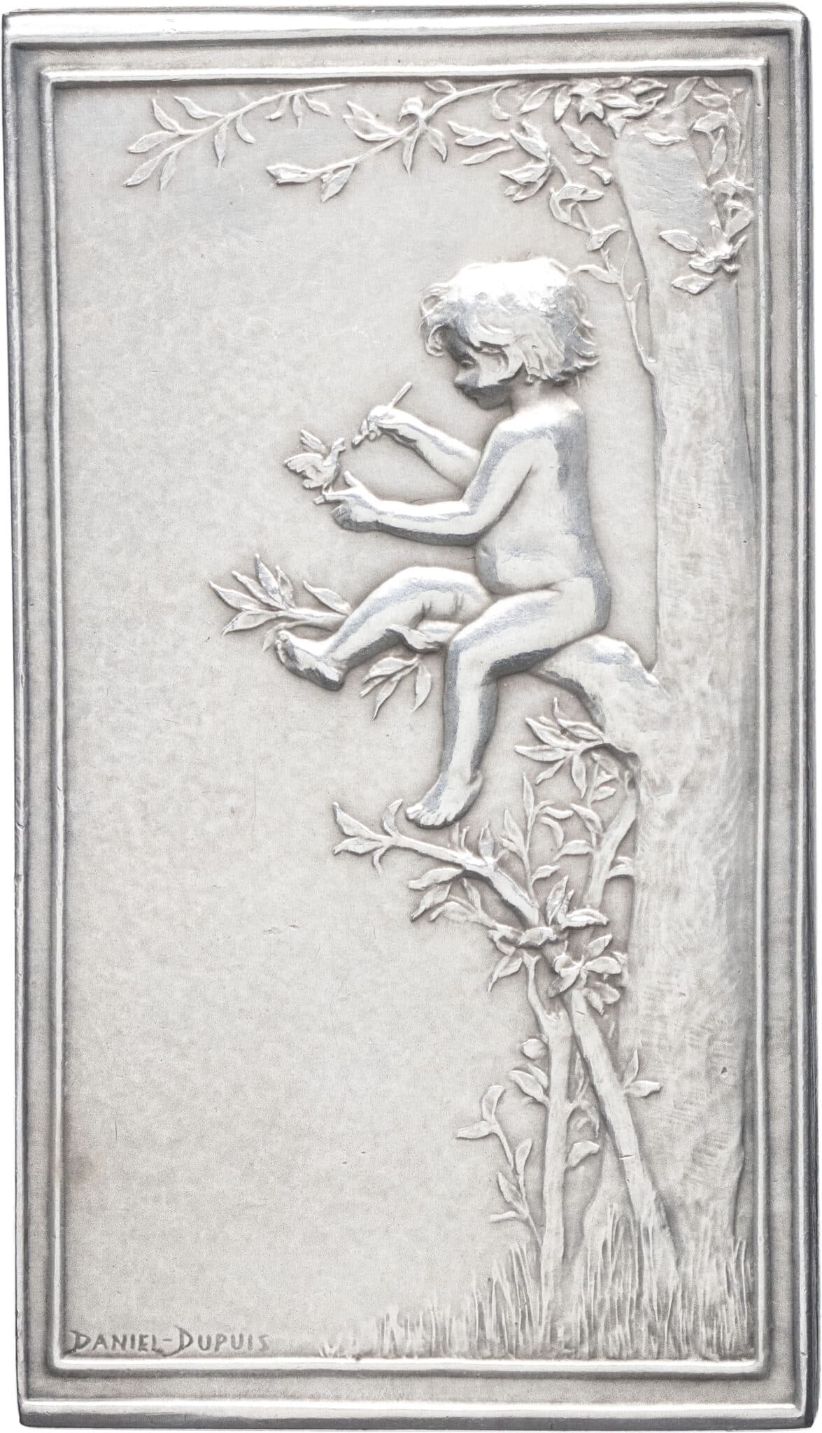 Rv. Un Amour assis à gauche sur une branche et jouant avec un oiseau ; signature DANIEL-DUPUIS.