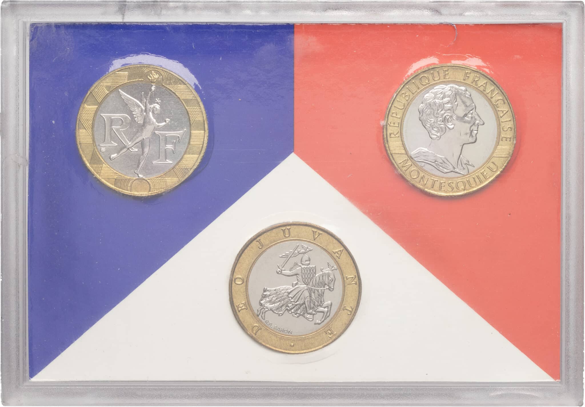 - Rainier III (1949-2005). Boîte fleur de coin avec les 3 monnaies de 10 francs 1989 : Génie de la Liberté, Montesquieu, Monaco 1989, Pessac.
