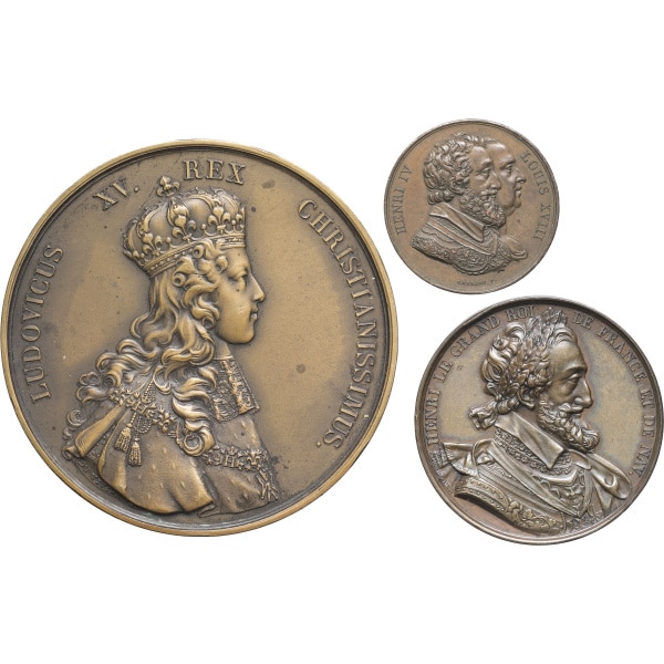 Sacre de Louis XV à Reims par Duvivier (73 mm, refrappe poinçon corne BRONZE) - Henri V / Henri IV par Durand (46 mm) - Henri IV / Louis XVIII par Gayrard (32,5 mm)