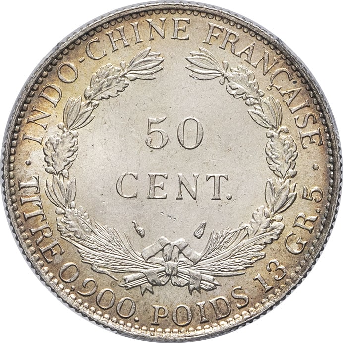 Rv. INDO-CHINE FRANÇAISE / TITRE 0.900 POIDS 13 GR 5. Dans une couronne formée de deux branches composites : 50 CENT. et (différents).