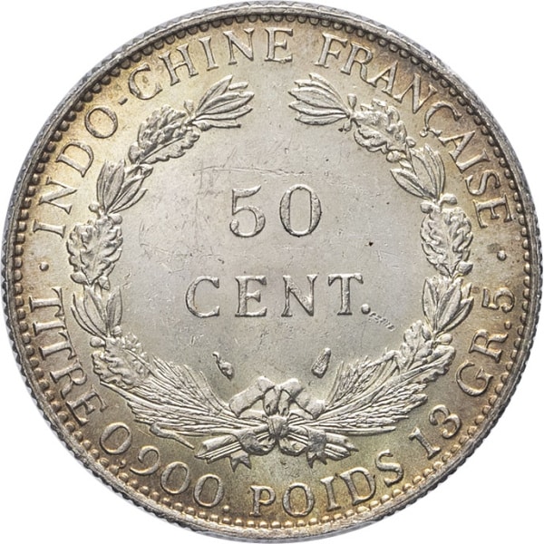 Rv. INDO-CHINE FRANÇAISE / TITRE 0.900 POIDS 13 GR 5. Dans une couronne formée de deux branches composites : 50 CENT. et (différents).