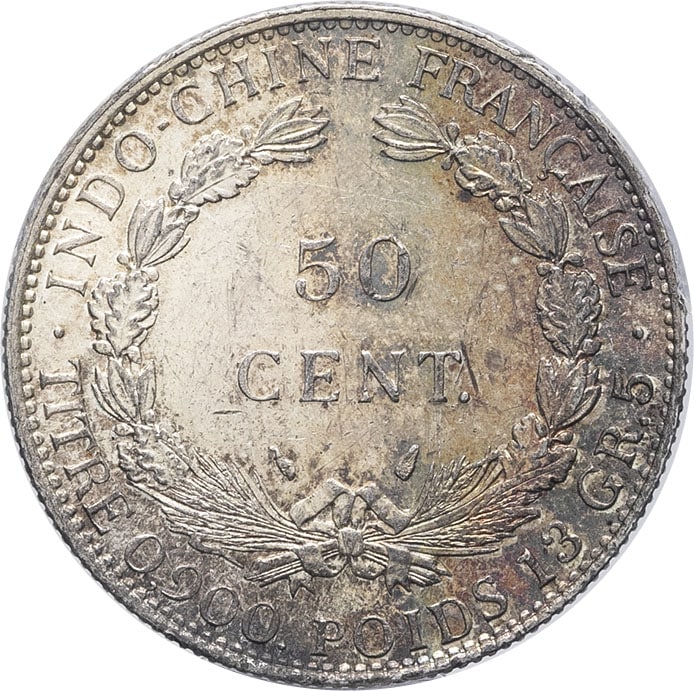 Rv. INDO-CHINE FRANÇAISE / TITRE 0.900 POIDS 13 GR 5. Dans une couronne formée de deux branches composites : 50 CENT. et (différents).