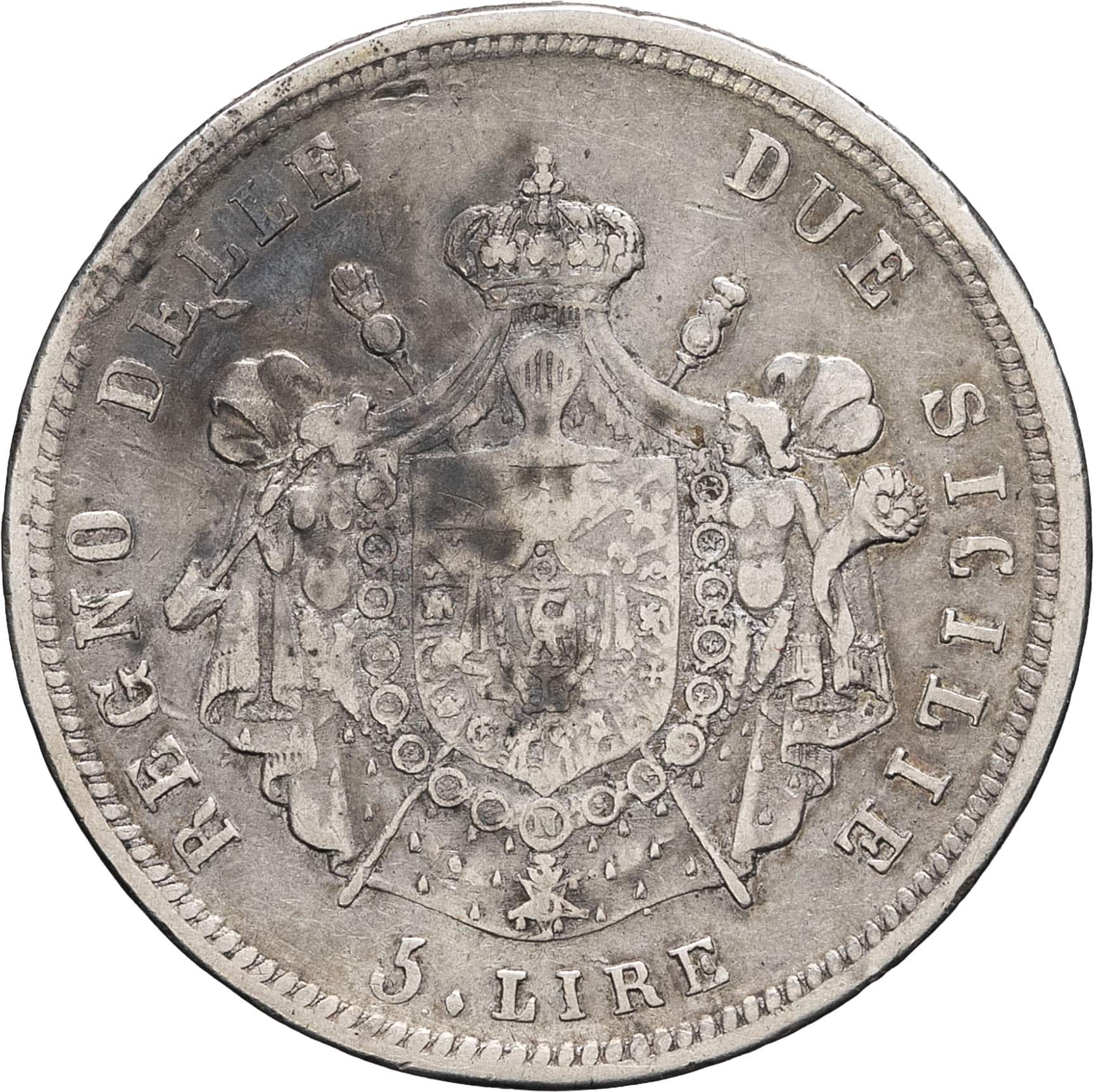 Rv. REGNO DELLE DUE SICILIE. Écu surmonté d’un heaume de face, posé sur le sceptre et la main de justice en sautoir, le tout posé sur un manteau couronné, au-dessous 5 LIRE.