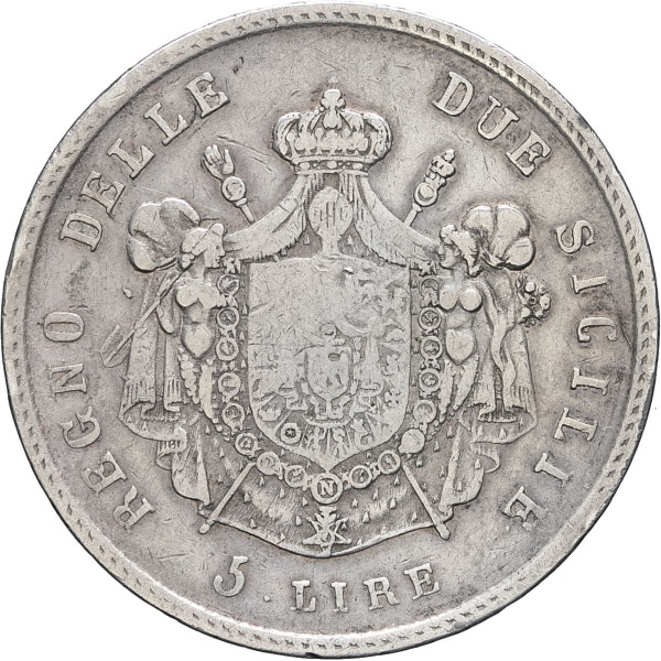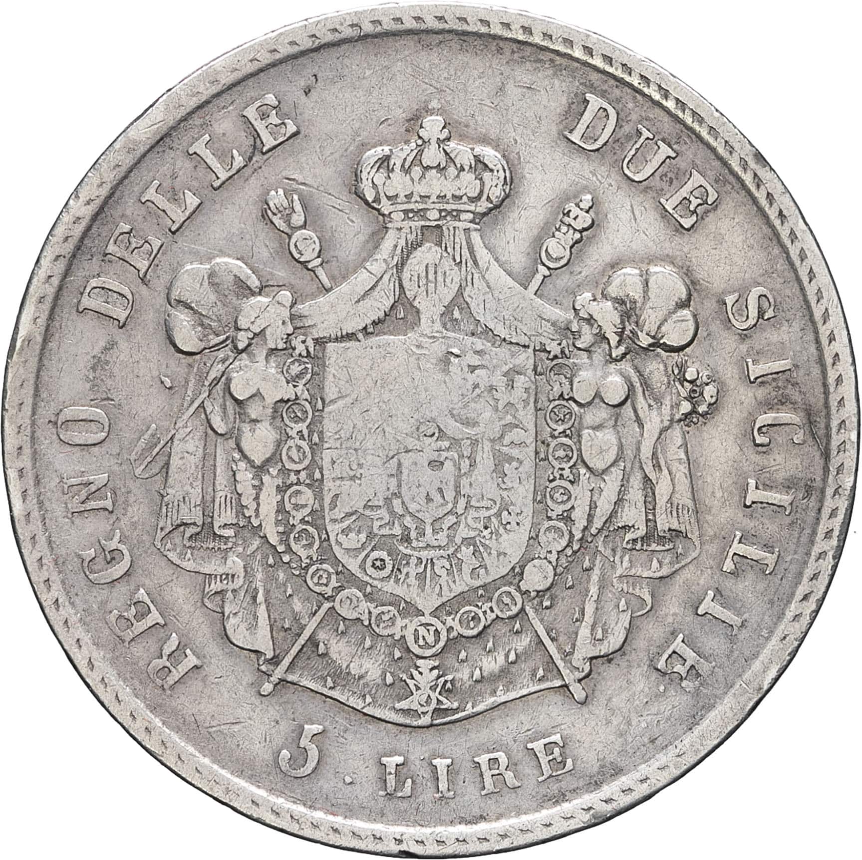 Rv. REGNO DELLE DUE SICILIE. Écu surmonté d’un heaume de face, posé sur le sceptre et la main de justice en sautoir, le tout posé sur un manteau couronné, au-dessous 5 LIRE.