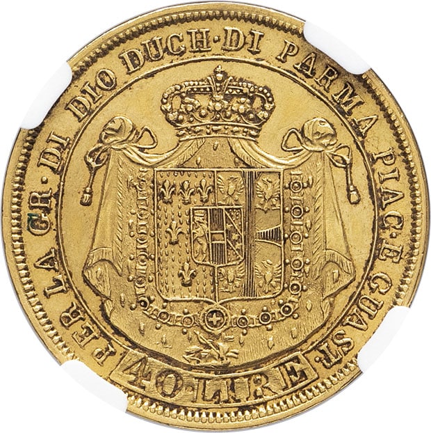 Rv. PER LA GR. DI DIO DUCH. DI PARMA PIAC. E GUAST. Armes entourées du collier et posées sur un manteau couronné, au-dessous 40. LIRE.