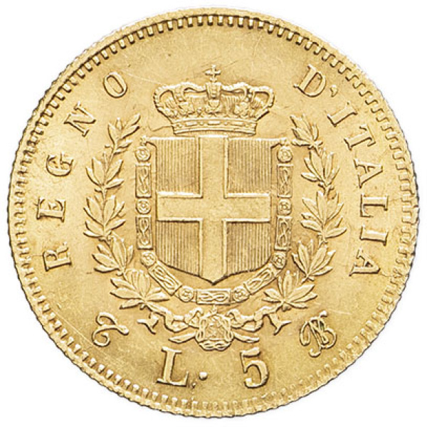 Rv. REGNO D’ITALIA. Dans une couronne formée de deux branches, écu couronné entouré du collier de l’ordre de l’Annonciade, au-dessous (atelier) L. 5 (différent).
