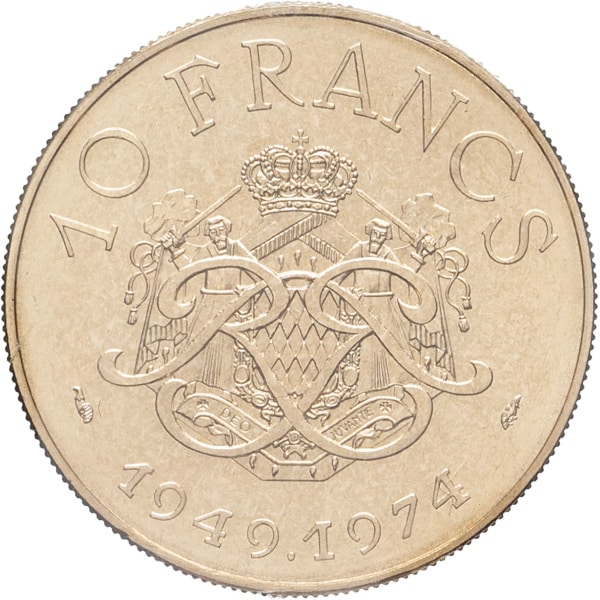 - Rainier III (1949-2005). Essai de 10 francs, 25e anniversaire de règne 1974, Paris.