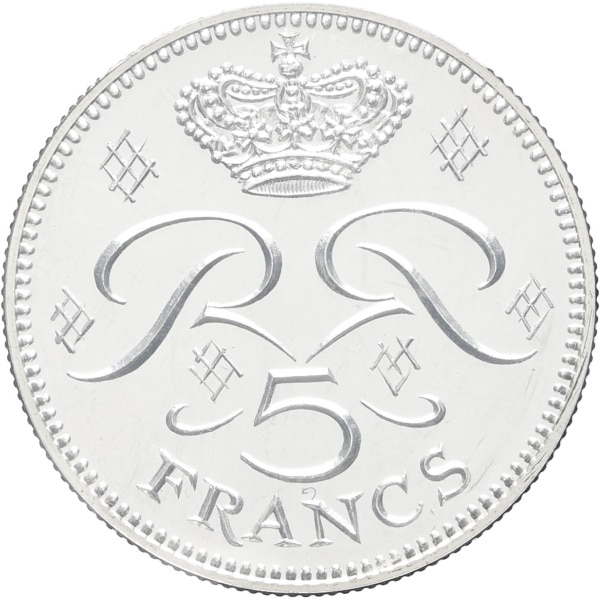 - Rainier III (1949-2005). Essai de 5 francs en argent 1974, Paris.