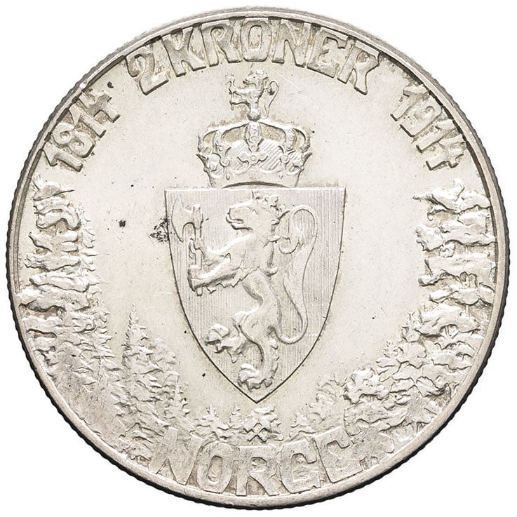 - NORWAY Haakon VII (1905-1957). 2 couronnes (2 kroner), centenaire de la Constitution 1914, Kongsberg.