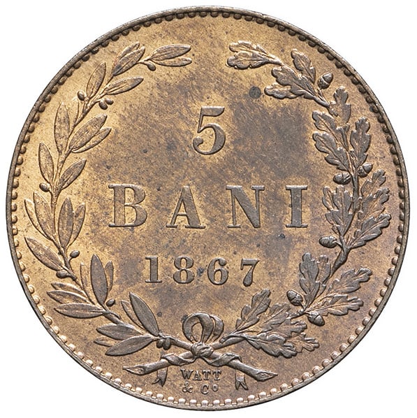 - ROMANIA Charles Ier, Prince (1866-1881). 5 bani 1867, Birmingham (Watt & Co).