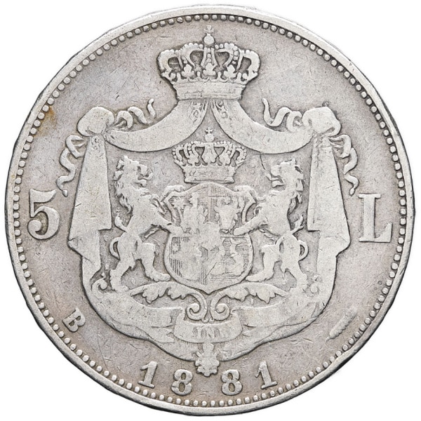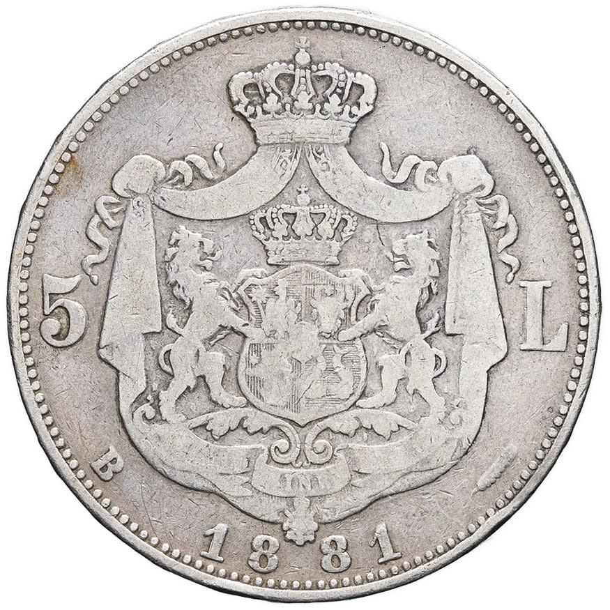 - ROMANIA Charles Ier, Roi (1881-1914). 5 lei type REGE, tranche en relief 1881, B, Bucarest.