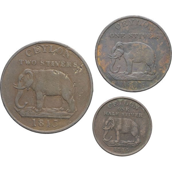 - CEYLON Georges III (1760-1820). Lot de 3 monnaies : deux, un et un demi stiver 1815, Londres.