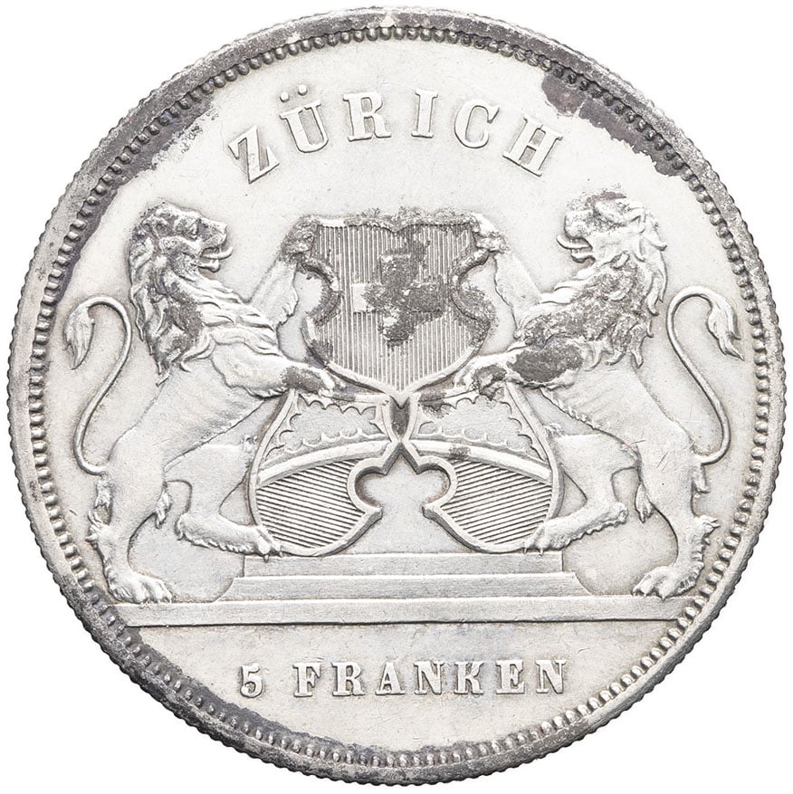 Av. ZÜRICH 5 FRANKEN. Sur un entablement, trois écus soutenus par deux lions.