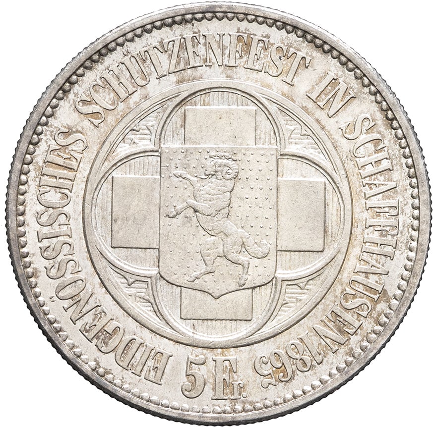 Rv. EIDGENOSSISCHES SCHÜTZENFEST IN SCHAFFHAUSEN (date) / 5 Fr. Armes de Schaffhouse dans un polylobe.