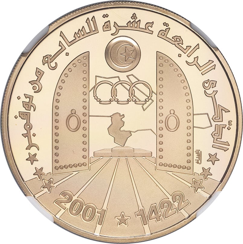 - TUNISIA Zine el-Abidine Ben Ali (1987-2011). 50 dinars, 14e anniversaire du 7 novembre 1987 et Jeux méditerranéens (légende en arabe), Flan bruni (PROOF) AH 1422 - 2001, Pessac.