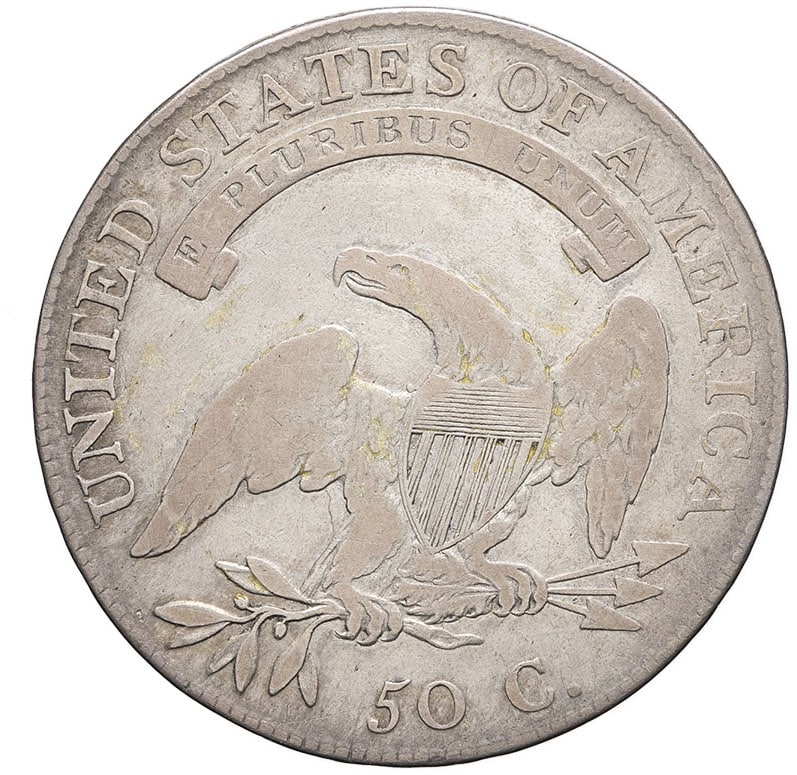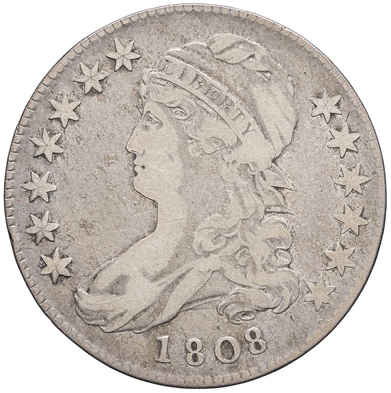 - UNITED STATES OF AMERICA République fédérale des États-Unis d’Amérique (1776-à nos jours). 50 cents, buste coiffé, tranche inscrite (capped bust half dollar, lettered edge) 1808, Philadelphie.
