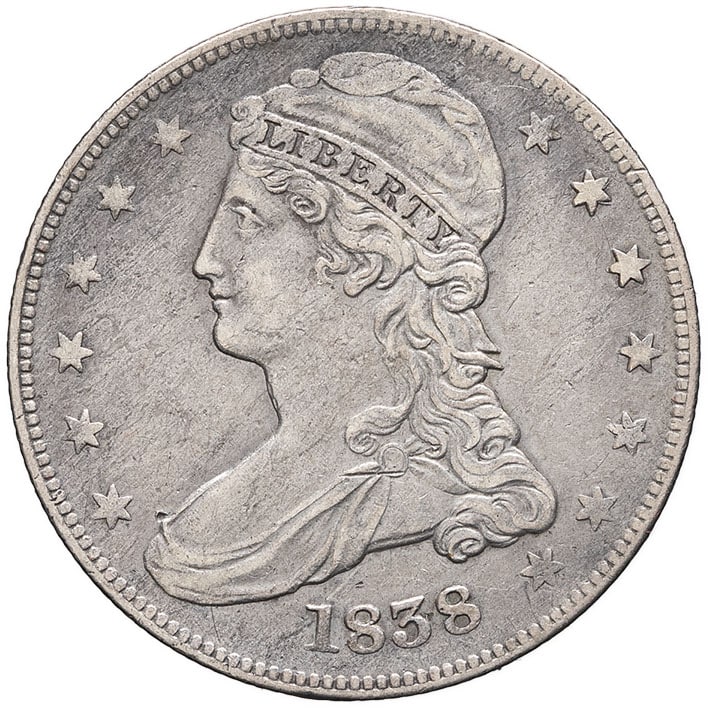 - UNITED STATES OF AMERICA République fédérale des États-Unis d’Amérique (1776-à nos jours). Demi-dollar, buste coiffé, tranche striée (capped bust half dollar, reeded edge) 1838, Philadelphie.