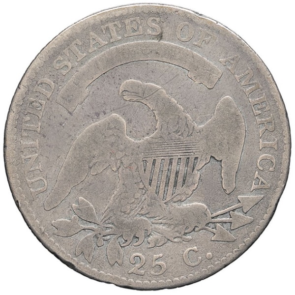 - UNITED STATES OF AMERICA République fédérale des États-Unis d’Amérique (1776-à nos jours). 25 cents, buste coiffé, grand module (capped bust quarter, large size) 1818, Philadelphie.