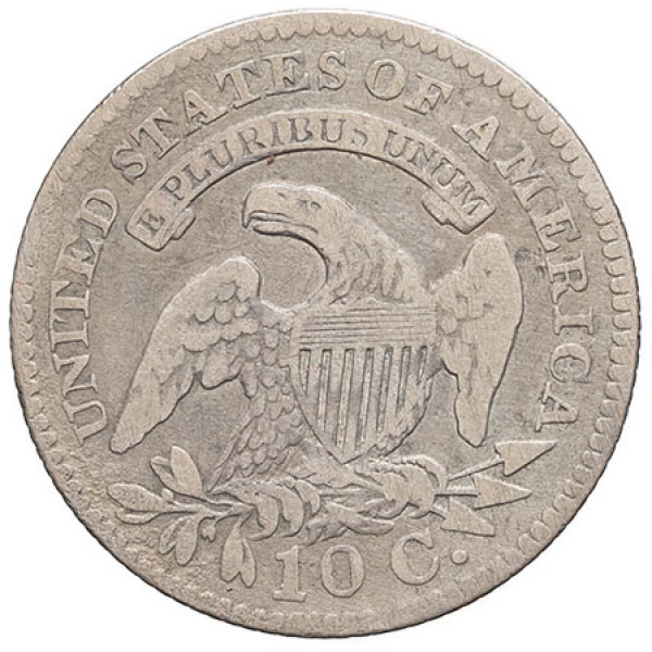 - UNITED STATES OF AMERICA République fédérale des États-Unis d’Amérique (1776-à nos jours). 10 cents, buste coiffé, grènetis large (capped bust dime, large dentils) 1827, Philadelphie.