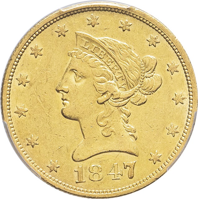 - UNITED STATES OF AMERICA République fédérale des États-Unis d’Amérique (1776-à nos jours). 10 dollars Liberty, sans devise 1847, Philadelphie.