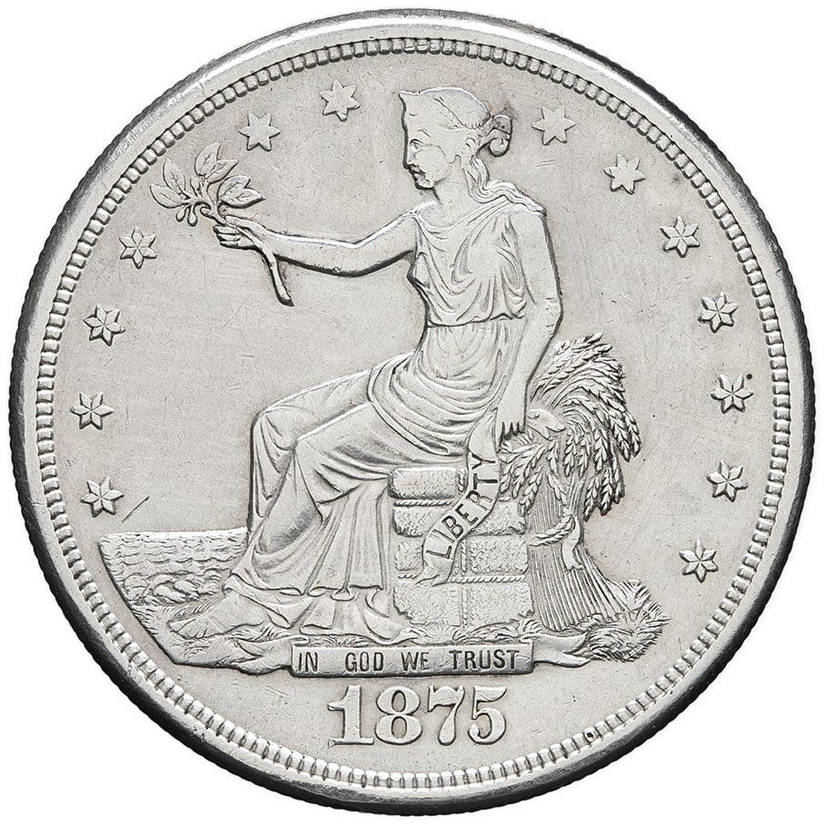 - UNITED STATES OF AMERICA République fédérale des États-Unis d’Amérique (1776-à nos jours). Dollar de commerce (trade dollar), à la Liberté assise 1875, S, San Francisco.