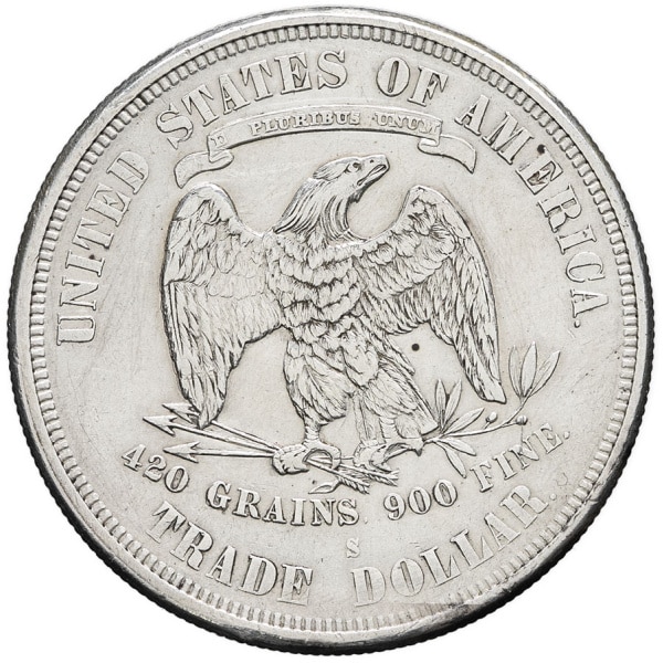 Rv. UNITED STATES OF AMERICA/ TRADE DOLLAR. Aigle éployée à gauche, tête à droite, sur une branche d’olivier et trois flèches en sautoir. Au-dessus, banderole inscrite E PLURIBUS UNUM. Au-dessous 420 GRAINS, 900 FINE et (atelier).