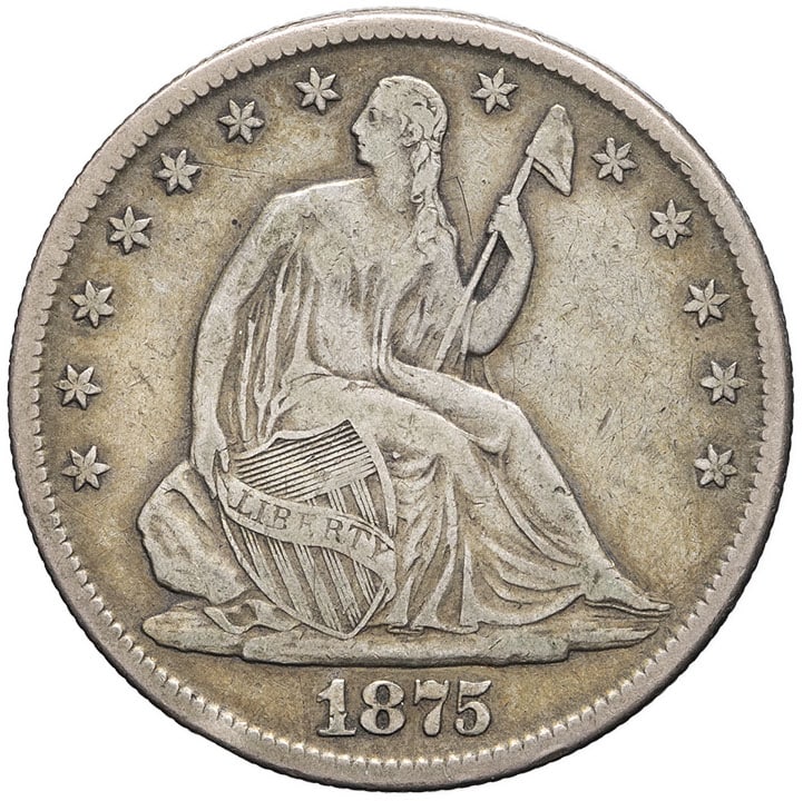 - UNITED STATES OF AMERICA République fédérale des États-Unis d’Amérique (1776-à nos jours). Demi-dollar, Liberté assise, avec devise (Liberty seated half dollar, with motto) 1875, Philadelphie.