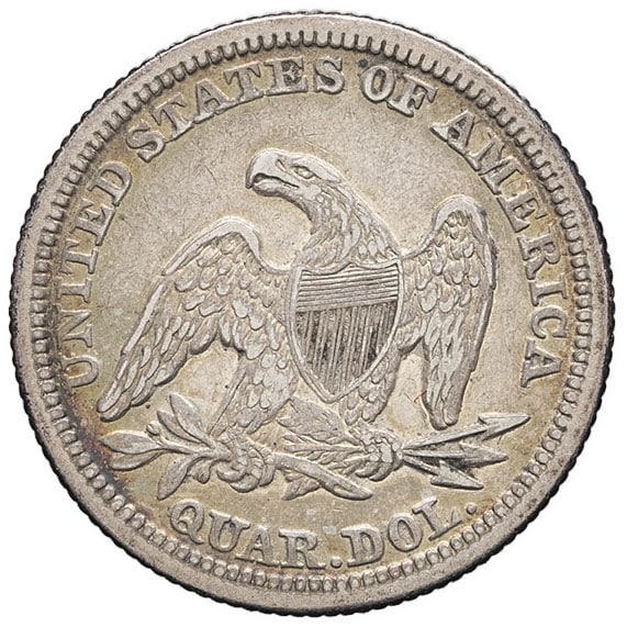 - UNITED STATES OF AMERICA République fédérale des États-Unis d’Amérique (1776-à nos jours). Quart de dollar, Liberté assise, sans devise (Liberty seated quarter, no motto) 1845, Philadelphie.