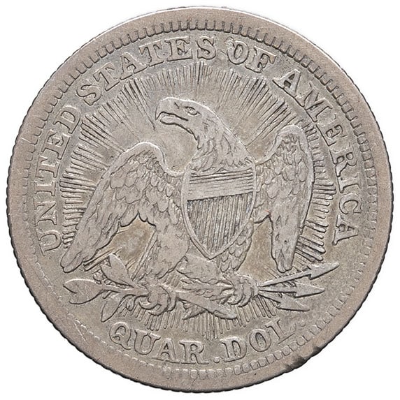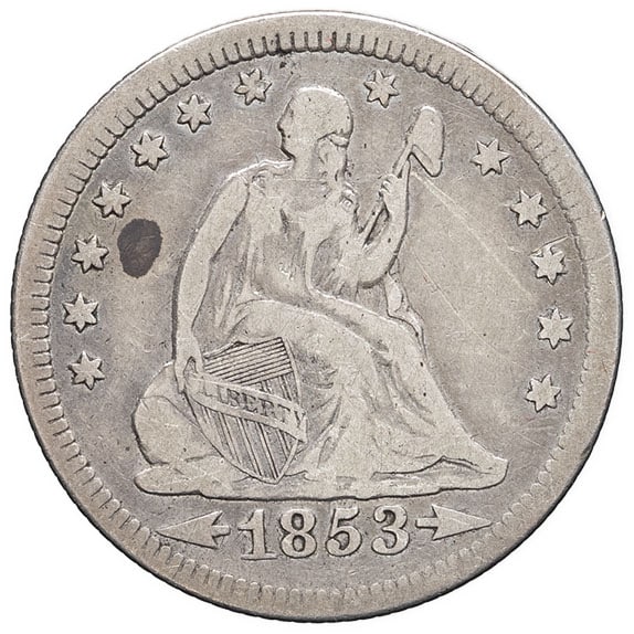 - UNITED STATES OF AMERICA République fédérale des États-Unis d’Amérique (1776-à nos jours). Quart de dollar, Liberté assise, flèches et rayons (Liberty seated quarter, arrows & rays) 1853, Philadelphie.