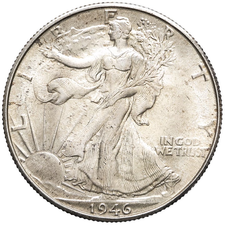 - UNITED STATES OF AMERICA République fédérale des États-Unis d’Amérique (1776-à nos jours). Demi-dollar à la Liberté marchant (Liberty walking half dollar) 1946, D, Denver.