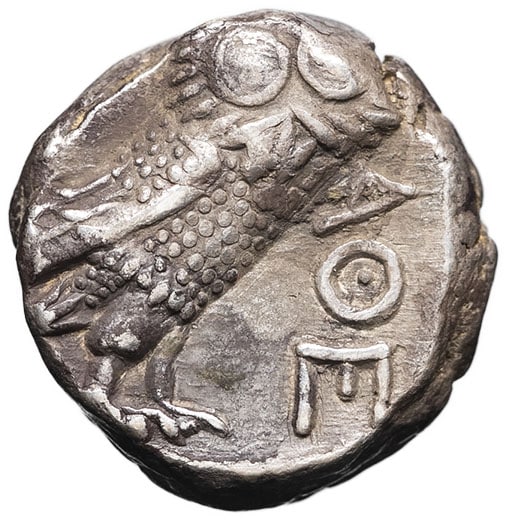 Rv. AΘE. Chouette debout à droite, regardant de face.
