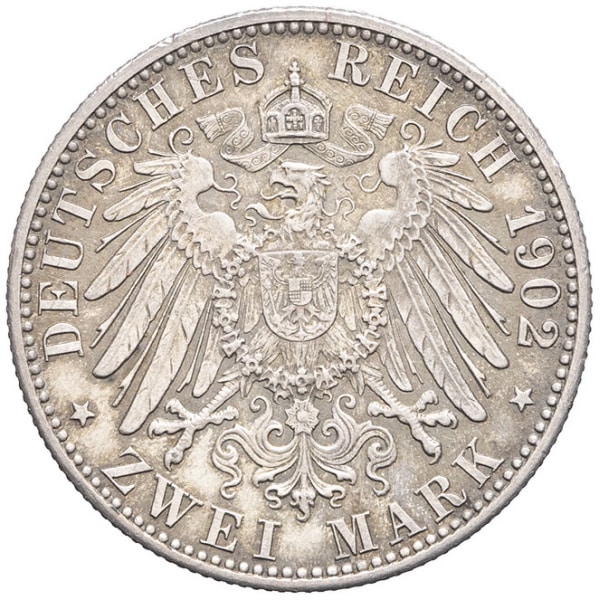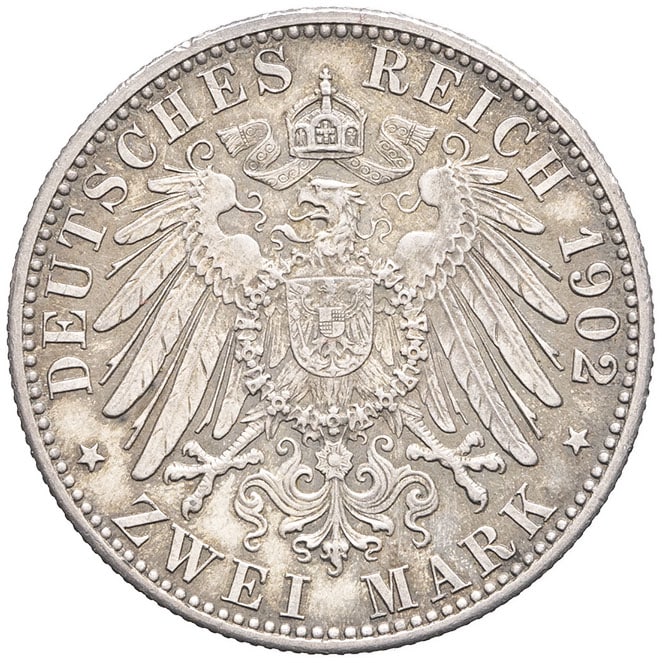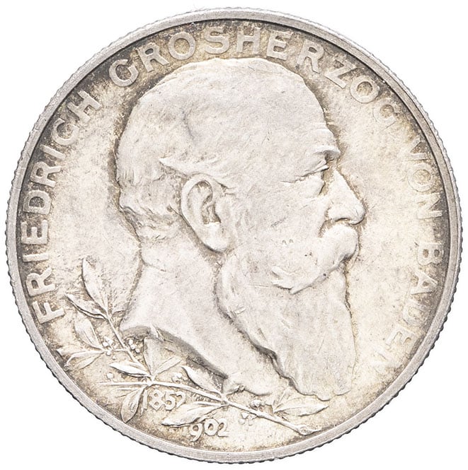 - GERMANY Bade, Frédéric I (1856-1907). 2 (zwei) mark, jubilé d’or 1902, Karlsruhe.