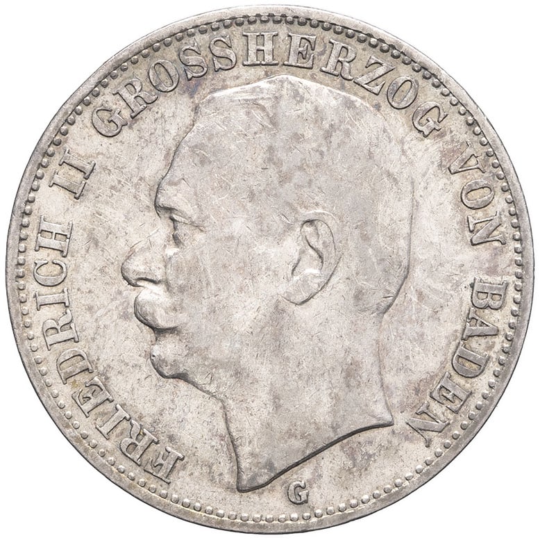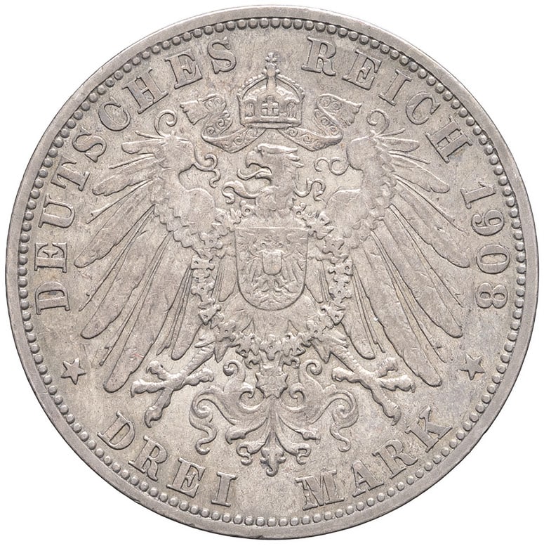 - GERMANY Bade, Frédéric II (1907-1918). 3 (drei) mark 1908, G, Karlsruhe.