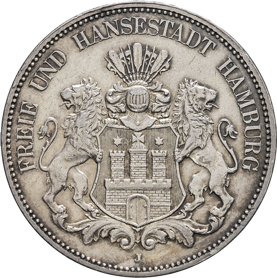 - GERMANY Hambourg (ville impériale de). 5 (fünf) mark 1913, J, Hambourg.