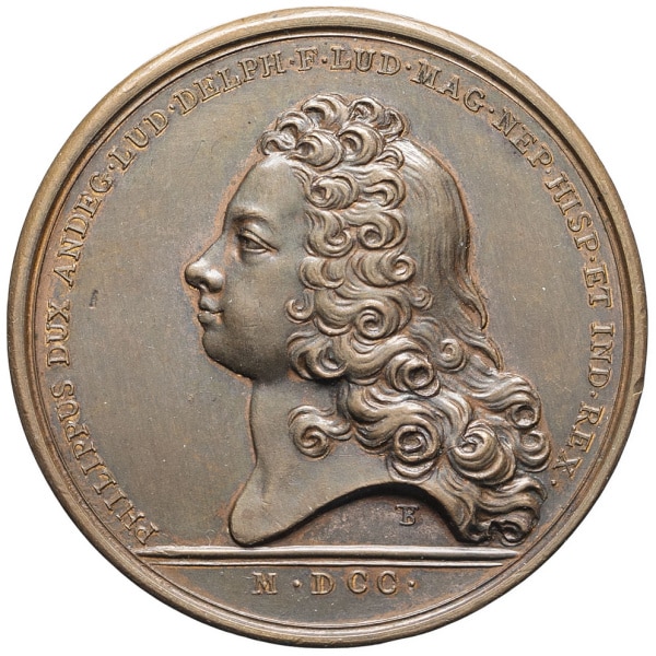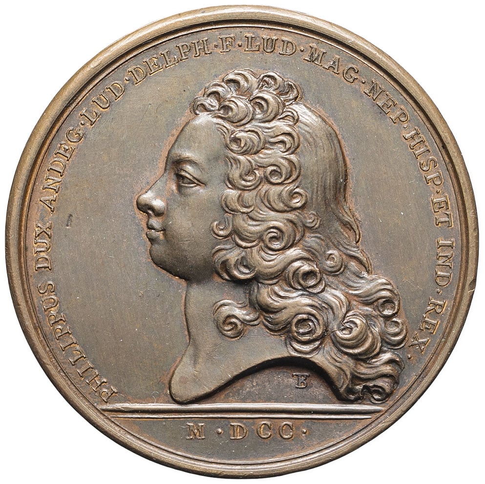 - FRANCE / ROYAL Louis XIV (1643-1715). Médaille, accession de Philippe duc d’Anjou à la couronne d’Espagne (Philippe V), par Mauger et Thomas Bernard 1700, Paris.