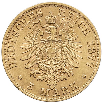 - GERMANY Prusse, Guillaume Ier (1861-1888). 5 mark 1877, C, Francfort.