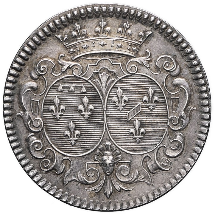 - FRANCE / ROYAL Louis XV (1715-1774). Jeton du Régent Philippe II duc d’Orléans, frappe postérieure avec Françoise-Marie de Bourbon, par Duvivier ND (frappe XIXe s.), Paris.