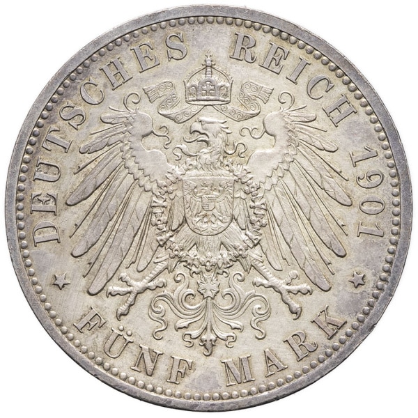 Rv. DEUTSCHES REICH (date) / * FÜNF MARK *. Aigle éployée et couronnée, avec écu en cœur.