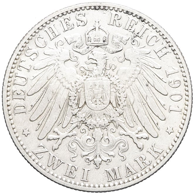 - GERMANY Saxe, Albert (1873-1902). 2 (zwei) mark 1901, E, Muldenhutten.