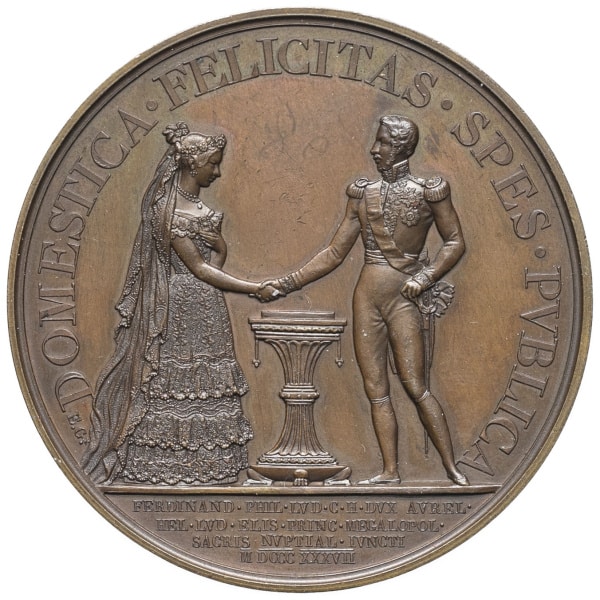 - Louis-Philippe Ier (1830-1848). Médaille, mariage de Ferdinand-Philippe duc d’Orléans et Hélène de Mecklenbourg-Schwerin, par Gatteaux 1837, Paris.