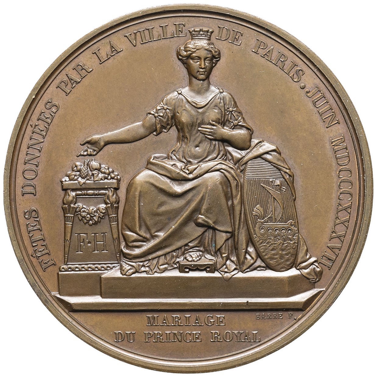 - Louis-Philippe Ier (1830-1848). Médaille, mariage de Ferdinand-Philippe duc d’Orléans et Hélène de Mecklenbourg-Schwerin, fêtes données par la ville de Paris, par Barre 1837, Paris.