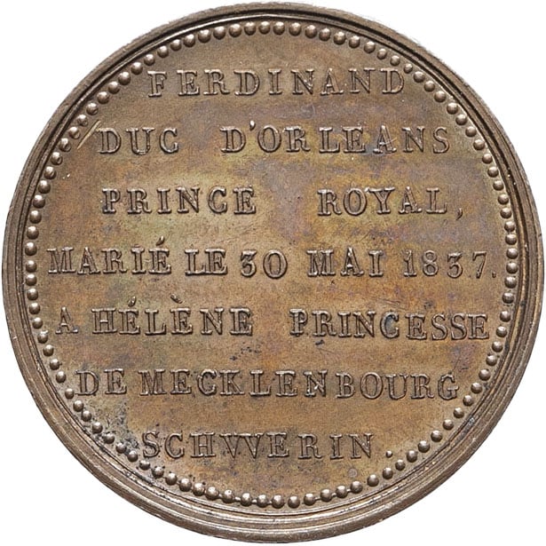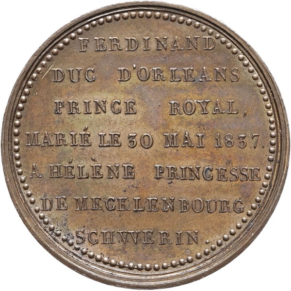 - Louis-Philippe Ier (1830-1848). Médaille, mariage de Ferdinand-Philippe duc d’Orléans et Hélène de Mecklembourg-Schwerin, par Montagny 1837, Paris.