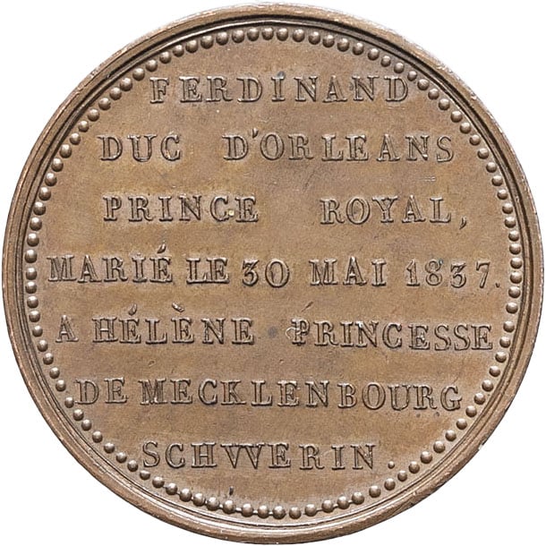 - Louis-Philippe Ier (1830-1848). Médaille, mariage de Ferdinand-Philippe duc d’Orléans et Hélène de Mecklembourg-Schwerin, par Montagny 1837, Paris.