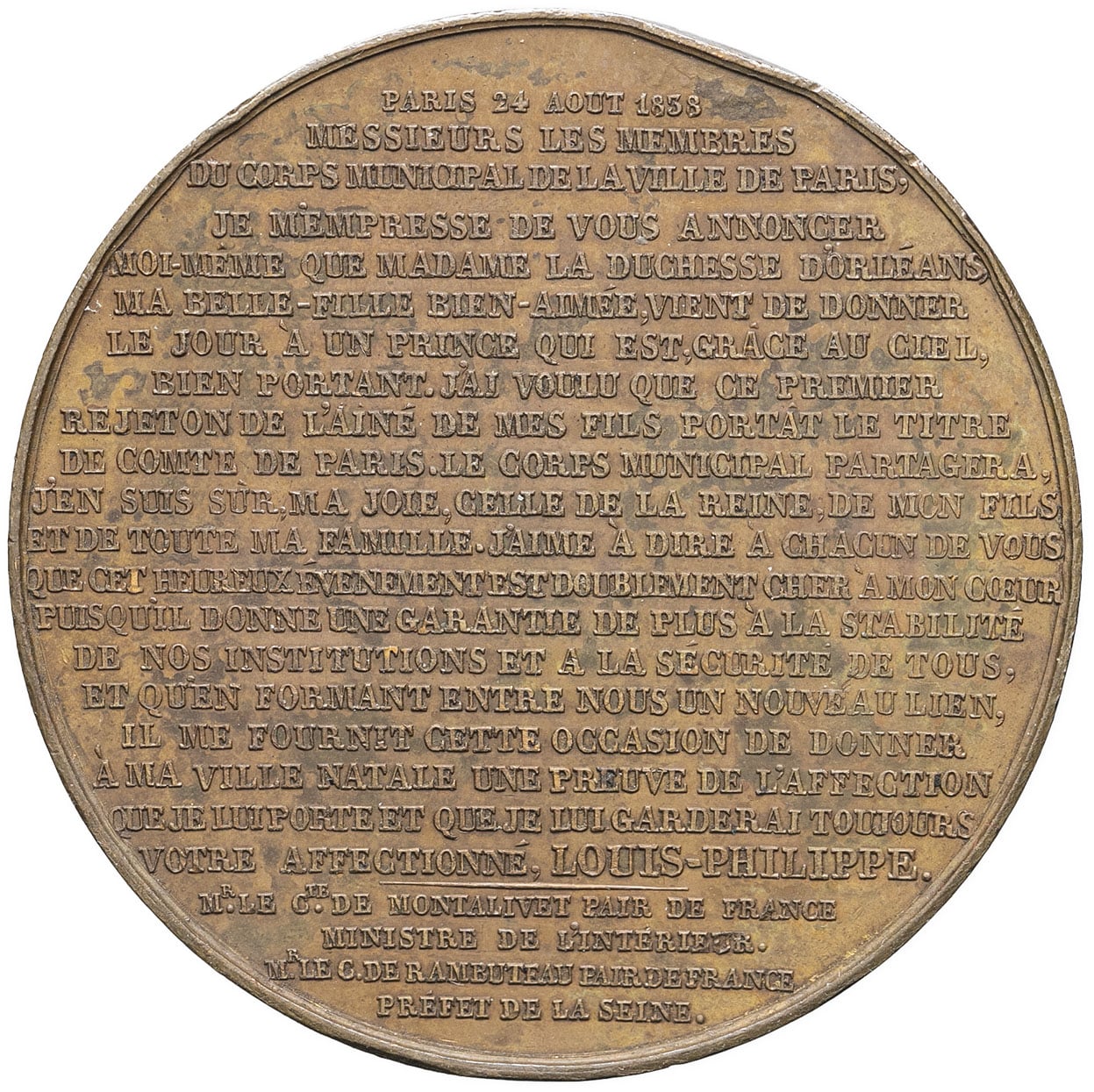 - Louis-Philippe Ier (1830-1848). Médaille, Louis-Philippe Ier annonce la naissance de Louis-Philippe-Albert comte de Paris, par Borrel 1838, Paris.